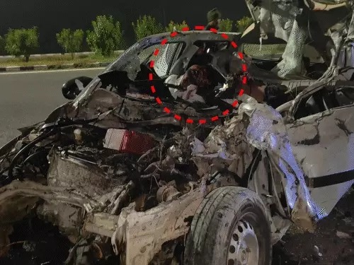 कार चकनाचूर, 100 मीटर तक टुकड़े बिखरे; सड़क हादसे ने इलाके में मचाई दहशत