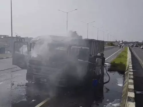 चलते डंपर में लगी आग: ड्राइवर-हेल्पर ने कूदकर बचाई जान, कुछ ही मिनटों में धू-धूकर जला वाहन