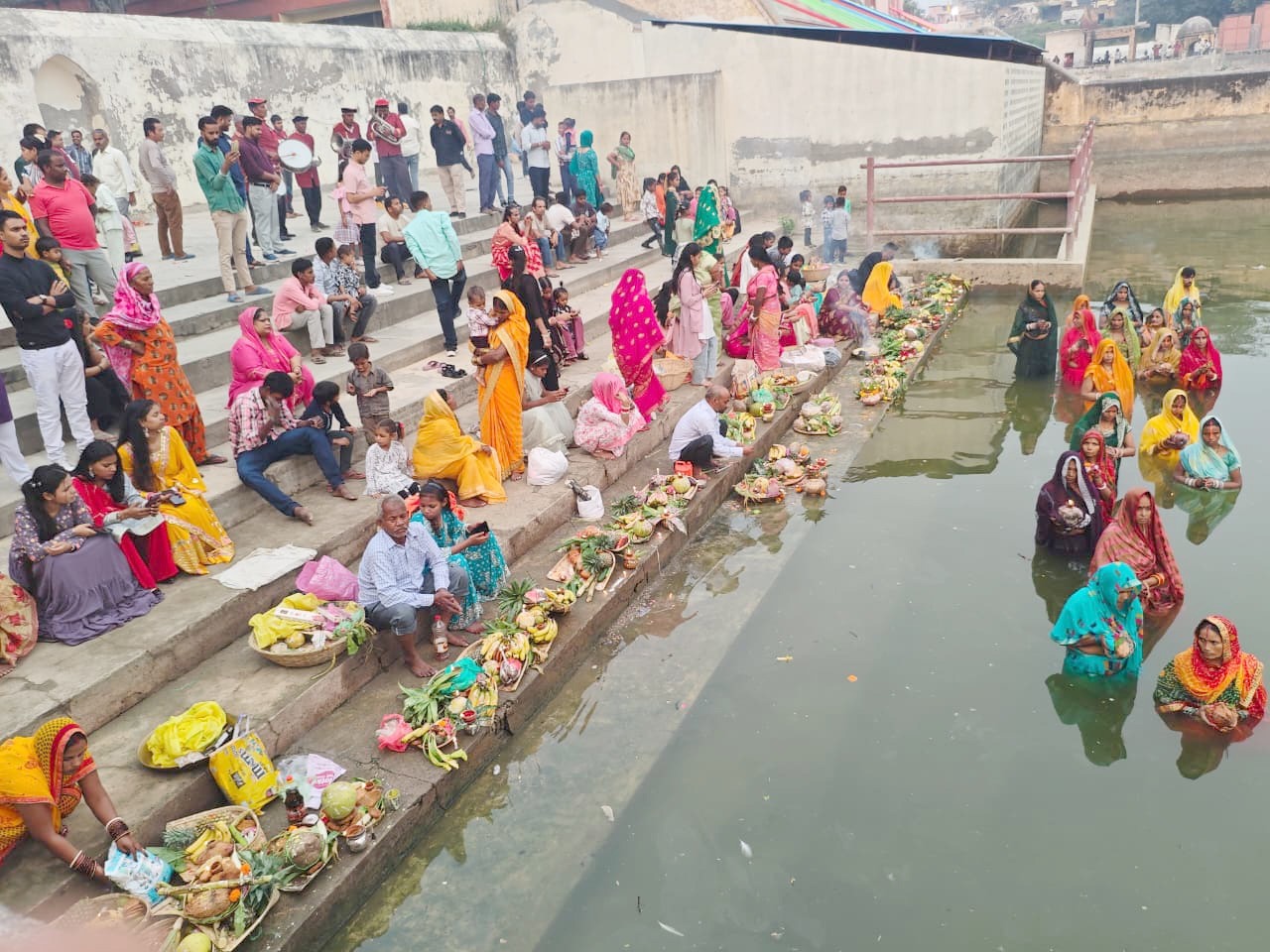 सफीदों, (एस• के• मित्तल) : नगर के ऐतिहासिक नागक्षेत्र सरोवर पर छठ पर्व धूमधाम से मनाया गया। इस उपलक्ष्य में नागक्षेत्र सरोवर के घाटो को दुल्हन की तरह से सजाया गया। इस पर्व को लेकर श्रद्धालुगण सांय को ही नगर के सरोवर पर पहुंच गए थे। श्रद्धालुओं ने यहां पहुंचकर पंडाल बनाकर पूजा-अर्चना की और डूबते सूर्य को अर्घ्य दिया था। उसके उपरांत अपने-अपने पांडाल में रात भर यहीं रहकर भजन-कीर्तन करते छठी मईया के गीत गाए। सुबह होते ही श्रद्धालुओं ने नागक्षेत्र सरोवर में डूबकी लगाई। पूजा-अर्चना के उपरांत उगते सूर्य को अर्घ्य देकर अपना कई दिनों से चल रहा अनुष्ठान संपन्न किया। नागक्षेत्र सरोवर पर प्रसाद वितरित करके अपने घरों को लौट गए।